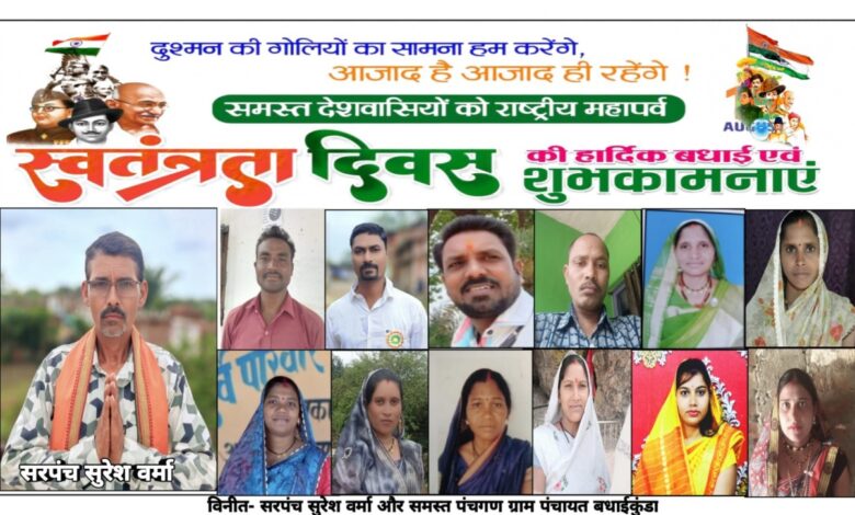 कवर्धा। स्वतंत्रता दिवस के पावन अवसर पर ग्राम पंचायत बधाईकुंडा के सरपंच सुरेश वर्मा तथा समस्त ग्रामवासियों ने देशवासियों, प्रदेशवासियों और जिलेवासियों को हार्दिक शुभकामनाएं दी हैं।