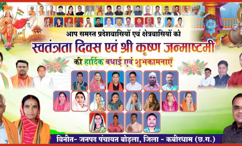 कवर्धा। स्वतंत्रता दिवस के पावन अवसर पर जनपद पंचायत बोड़ला के अध्यक्ष बालका रामकिंकर वर्मा और उपाध्यक्ष नन्द श्रीवास ने समस्त देशवासियों, प्रदेशवासियों और जिलेवासियों को हार्दिक शुभकामनाएं दी हैं।
