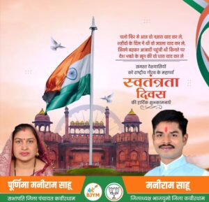 कवर्धा: स्वतंत्रता दिवस के अवसर पर जिला पंचायत सदस्य पूर्णिमा मनीराम साहू ने जिलेवासियों, प्रदेशवासियों और समस्त देशवासियों को हार्दिक शुभकामनाएं दी हैं।