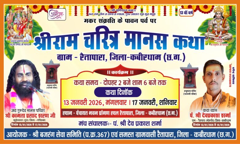 छत्तीसगढ़ के कबीरधाम जिले के पंडरिया तहसील अंतर्गत पावन ग्राम रैतापारा में भक्ति और श्रद्धा का अनुपम संगम देखने को मिलेगा। बजरंग सेवा समिति के तत्वावधान में पांच दिवसीय भक्तिमय श्री रामचरितमानस कथा का आयोजन किया जा रहा है, जिसकी तैयारियां जोर-शोर से चल रही हैं।