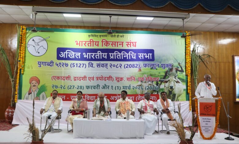 तेलंगाना: भारतीय किसान संघ की तीन दिवसीय अखिल भारतीय प्रतिनिधि सभा का शुभारंभ शुक्रवार को तेलंगाना के भाग्यनगर स्थित अन्नोजिगुड़ा के राष्ट्रीय विद्या केंद्र के सभागार में हुआ। उद्घाटन सत्र में अखिल भारतीय पदाधिकारियों की उपस्थिति में सर्वप्रथम भारत माता व भगवान बलराम के समक्ष दीप प्रज्ज्वलित कर अखिल भारतीय प्रतिनिधि सभा का विधिवत उद्घाटन किया गया। इससे पूर्व अखिल भारतीय प्रतिनिधि सभा में देश भर से शामिल होने पहुंचे किसान संघ के प्रांतीय पदाधिकारियों की उपस्थिति में प्रांगढ़ में ध्वजारोहण व गौ माता पूजन किया गया। प्रथम सत्र में किसान संघ के अखिल भारतीय अध्यक्ष के साई रेड्डी ने स्वागत भाषण दिया और महामंत्री मोहिनी मोहन मिश्र ने महामंत्री प्रतिवेदन का वाचन कर प्रतिनिधि सभा में किसान संघ के कार्यों को रखा। इस अवसर पर मंच पर चारों अखिल भारतीय उपाध्यक्ष रामभरोस बासोतिया, सुषीला विश्नोई, पेरूमल, विशाल चंद्राकर की उपस्थिति उल्लेखनीय रही। इसके साथ ही राष्ट्रीय स्वयंसेवक संघ के अखिल भारतीय संपर्क प्रमुख रामलाल जी, प्रांत प्रचारक श्रीधर जी, अखिल भारतीय संगठन मंत्री दिनेश कुलकर्णी, सह संगठन मंत्री गजेन्द्र सिंह उपस्थित रहे।